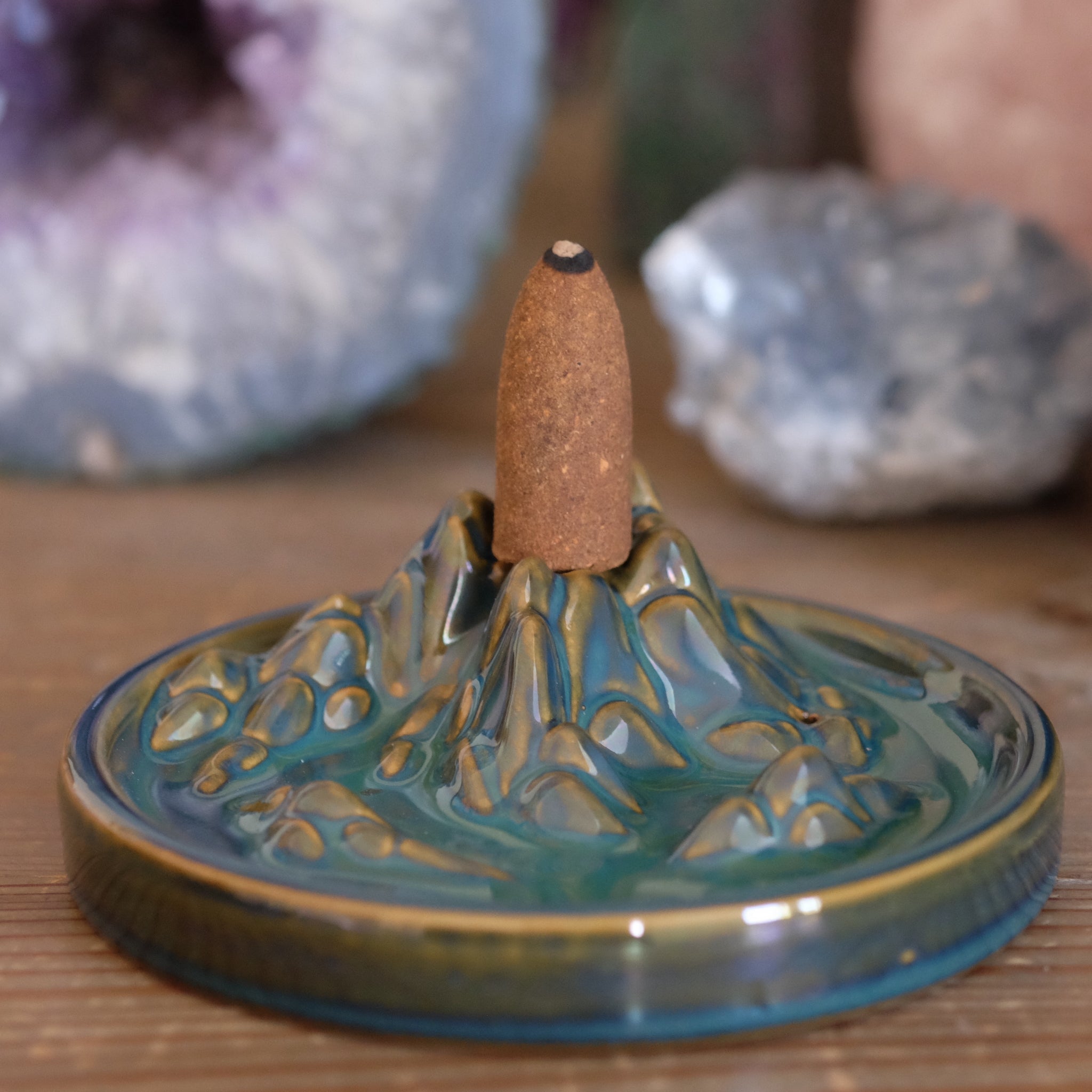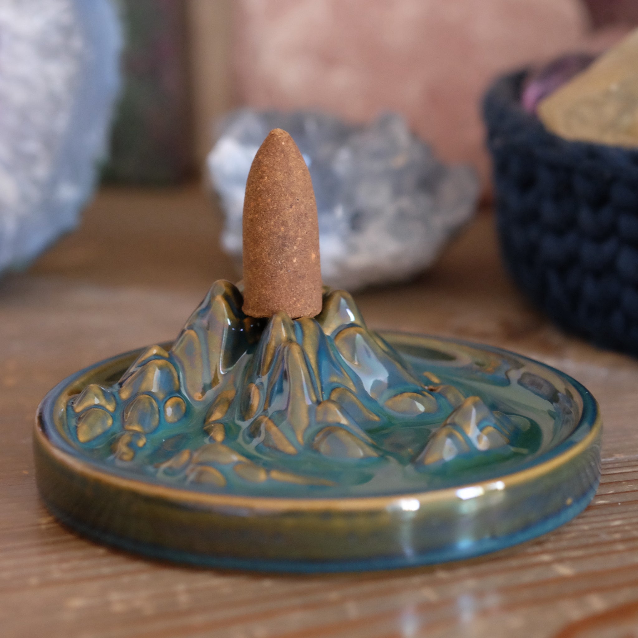 This Incense Backflow Mountain Burner in a beautiful shade of green is a perfect blend of function and aesthetic. Its glossy finish enhances its appearance, evoking the peaceful atmosphere of a serene mountain retreat. As incense smoke flows downward in mesmerising waves, it creates a calming visual effect that mirrors the misty air of a mountainous landscape. This burner is not only a practical way to enjoy the soothing aroma of incense but also a stunning decorative piece that adds tranquility and natural beauty to any space. Perfect for those seeking a peaceful, meditative ambiance.
