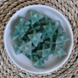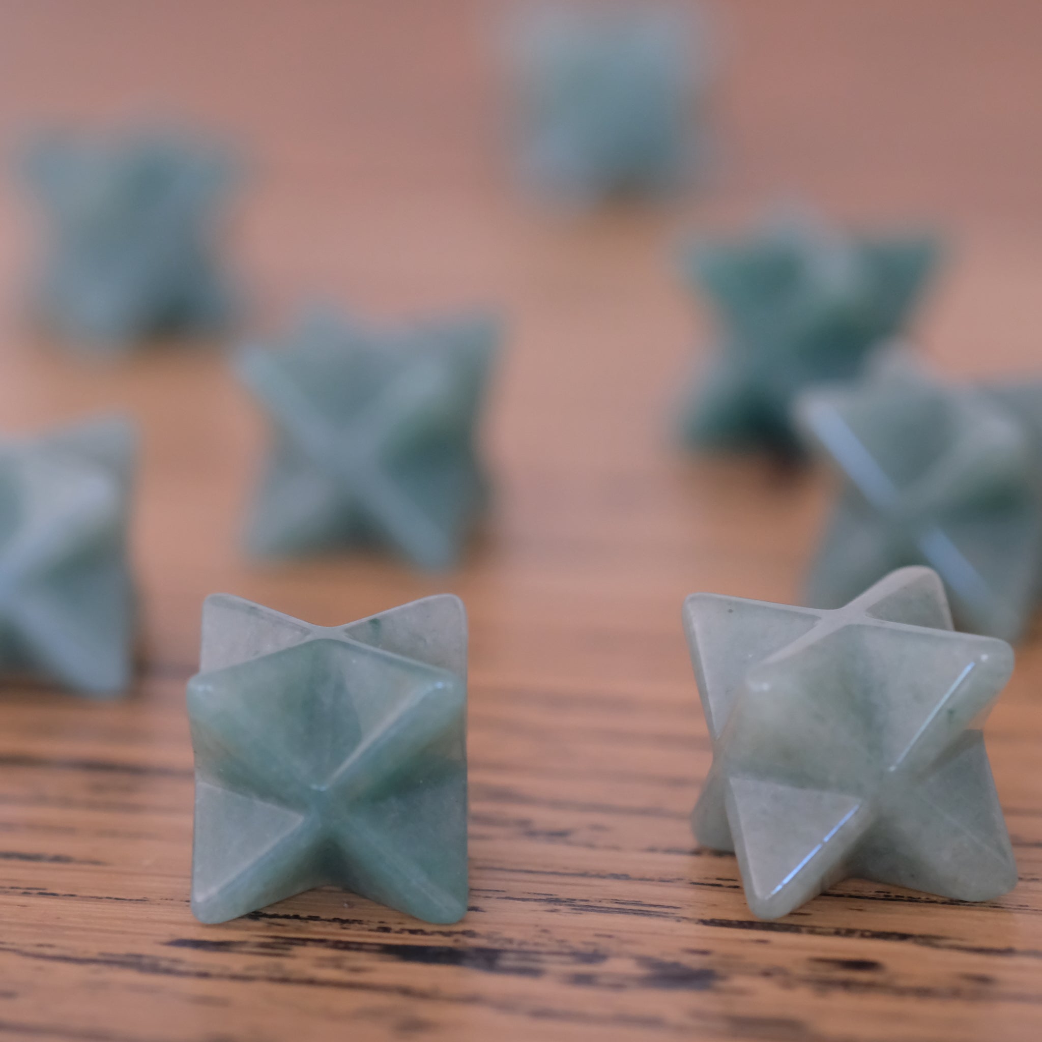 Green Aventurine Merkaba Star symbolise the union of the spirit of the body surrounded by light and comes from three separate words in Hebrew - 'Mer' meaning Light, 'Ka' meaning spirit and 'Ba' meaning body. The Merkaba is an eight pointed star created from two triangular pyramids and can be a source of power and enlightenment. Great to be used during mediation or Reiki. These little cuties are loved by kids and adults alike.