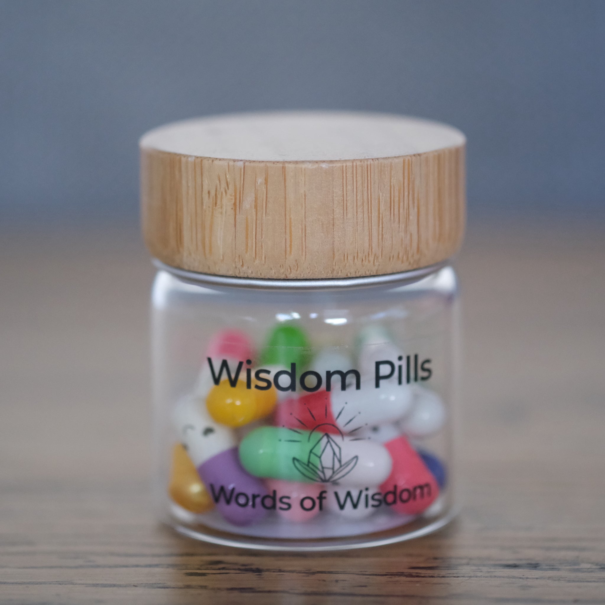 Pills come in a glass jar with a bamboo screw lid. The type of Wisdom Pill is shown with a sticker on the back that can be easily removed.