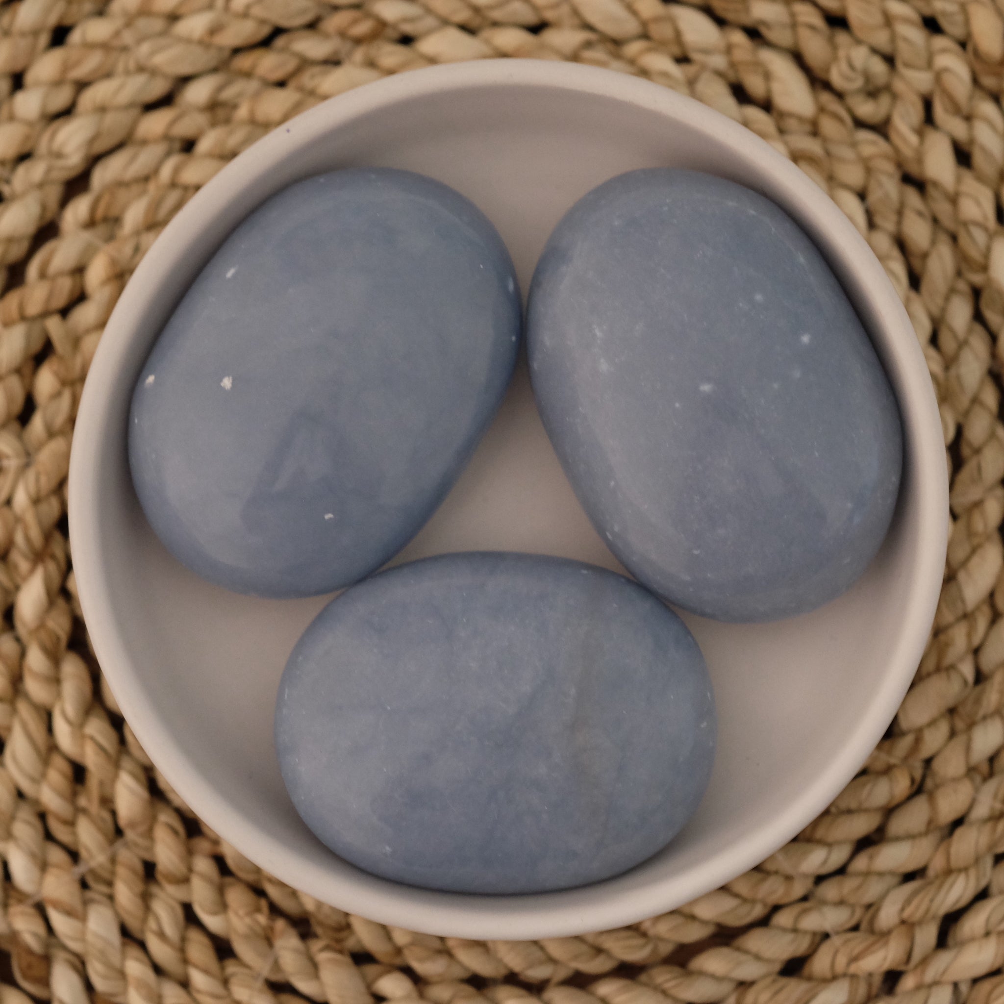 Angelite Palm Stones are polished stones that are perfect to hold in your hand or put in your pocket. They are great if you need a bit of extra courage to get you through a difficult situation as they create calmness and focus with your energy centred on the stone. Some of the Crystal Palm Stones may be flat or have a puffy look and feel.