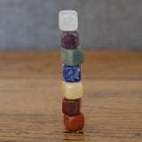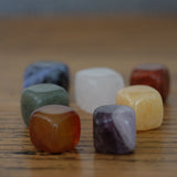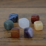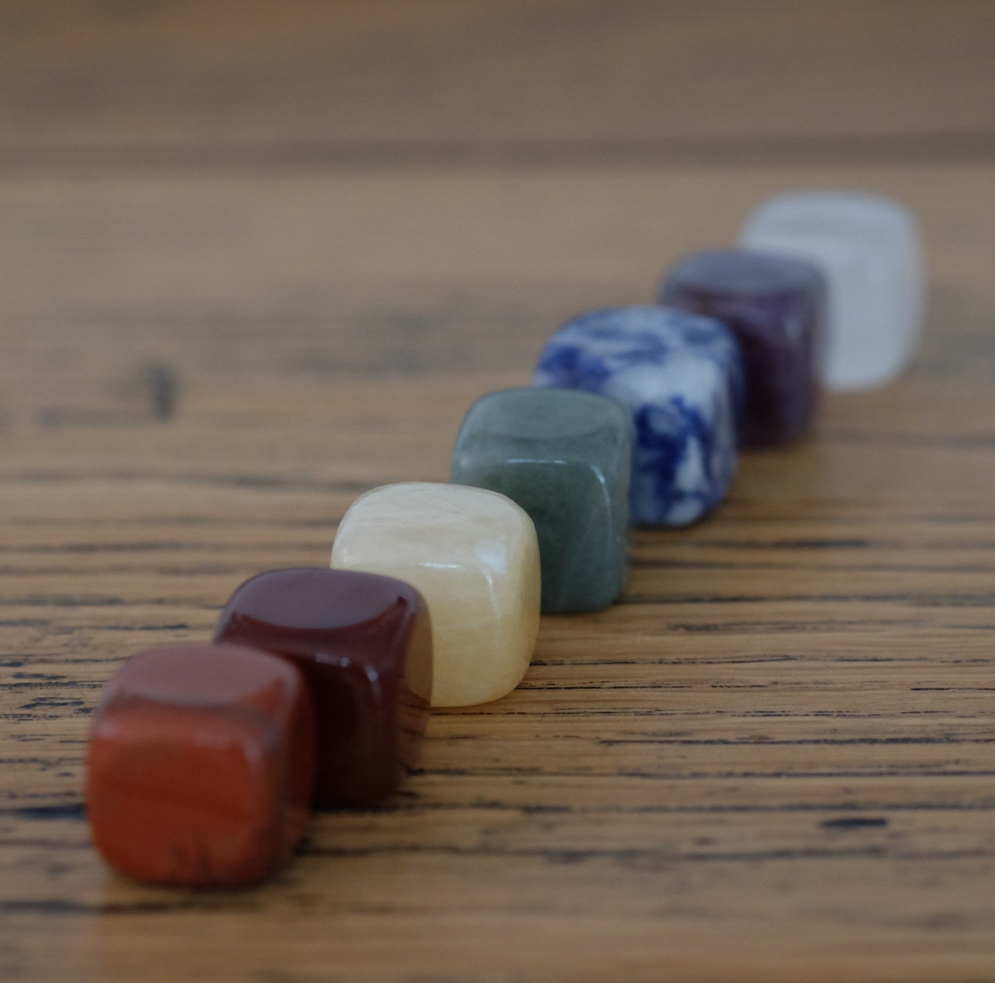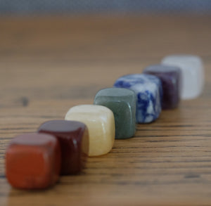Chakra Crystal Cube Set include 7 Crystal cube with the colours and stones of the Chakra. This includes Red Agate, Red Jasper, Yellow Jade, Green Aventurine, Amethyst, Sodalite & Clear Quartz.