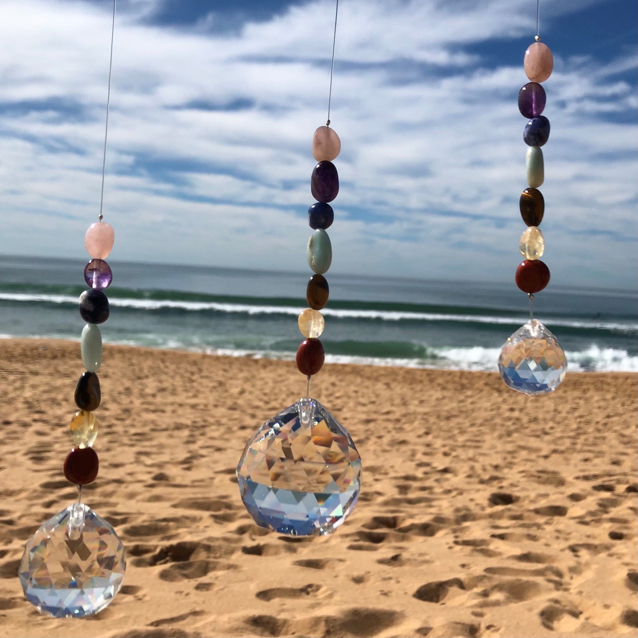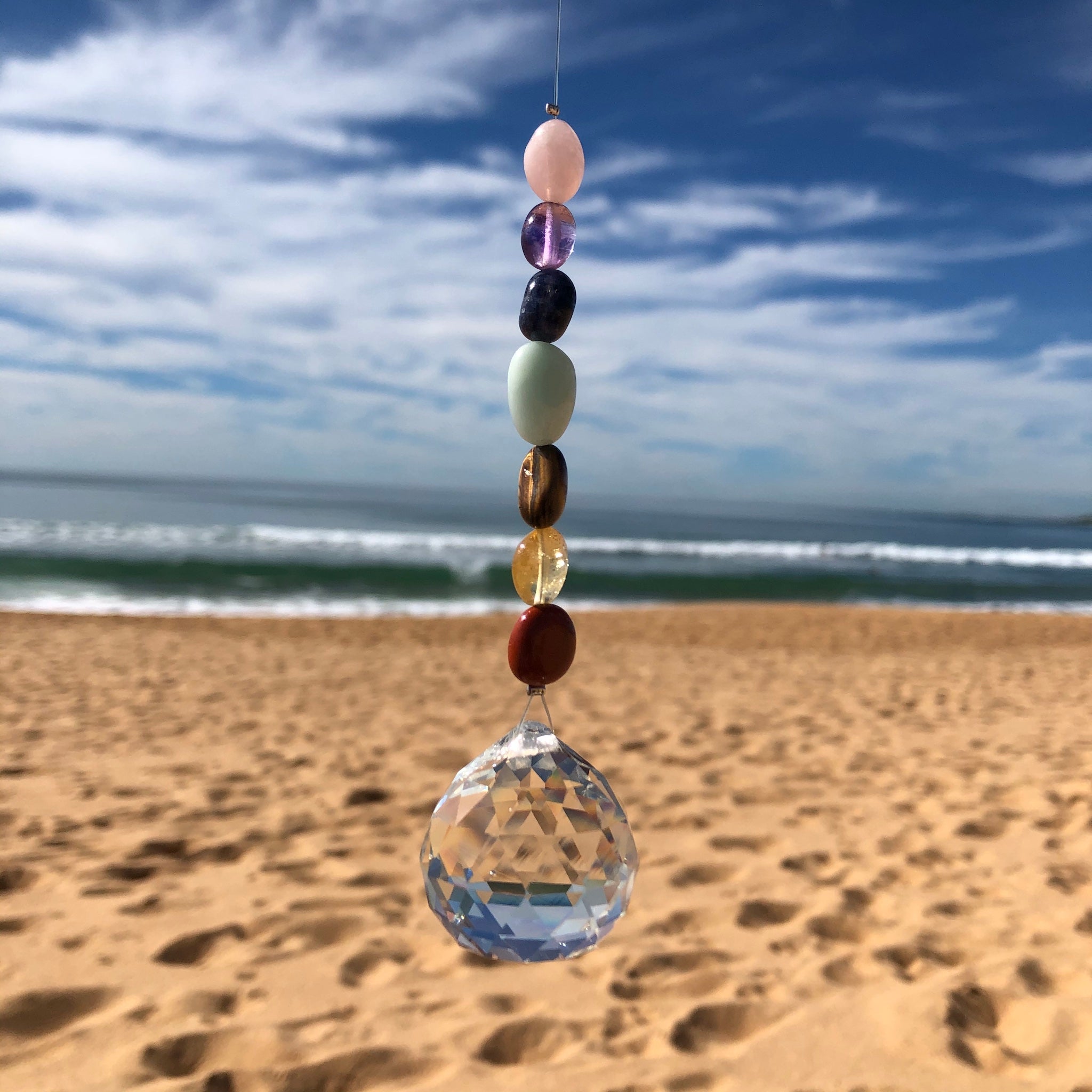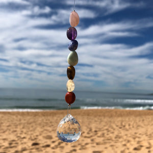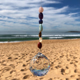 Let the beautiful colourful light shine in your home or office with this gorgeous Chakra Suncatcher. The Suncatchers with a range of crystal beads on the string have been designed and created for us. Hang these in your window to capture the light and bring a rainbow of happiness, joy and peace to your environment. Sun Catchers are great for yourself or as a gift to shine bright.