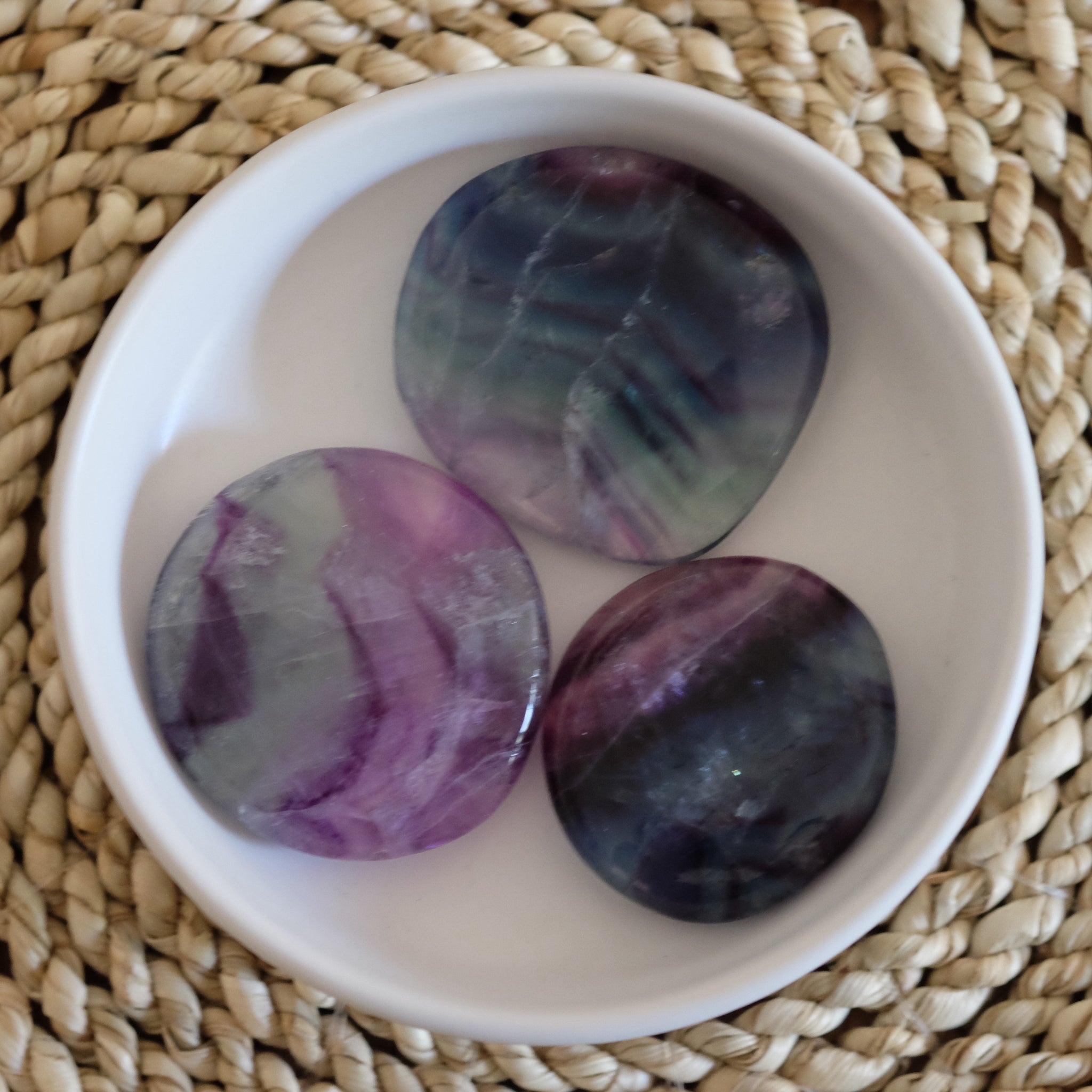 These Fluorite Palm Stones have a flat appearance.