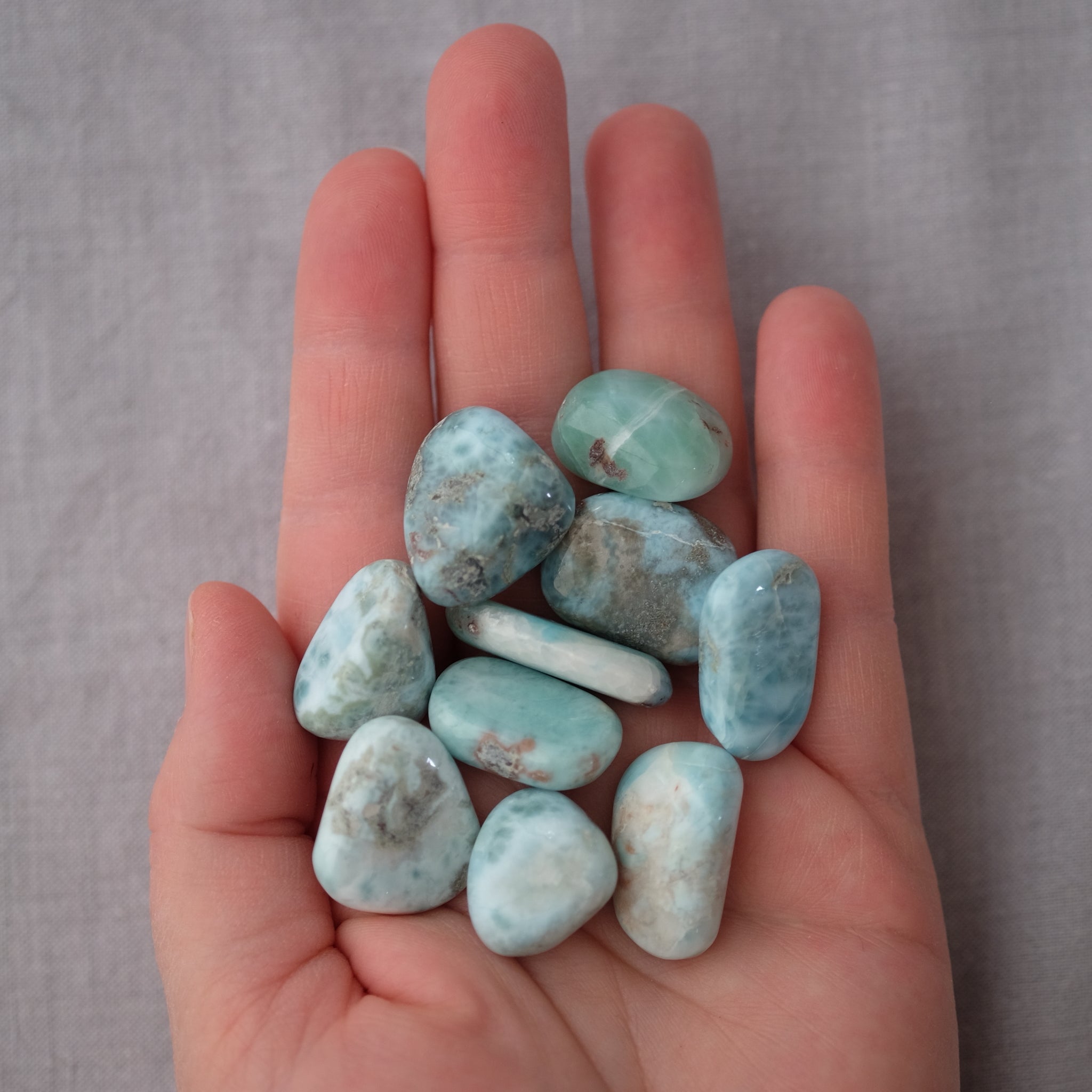Larimar Tumbled Stones are polished stones that have a smooth surface with the rough edges tumbled out. This shape is perfect to carry in your pocket for those times when you need an energy boost or to use in meditation or Reiki.