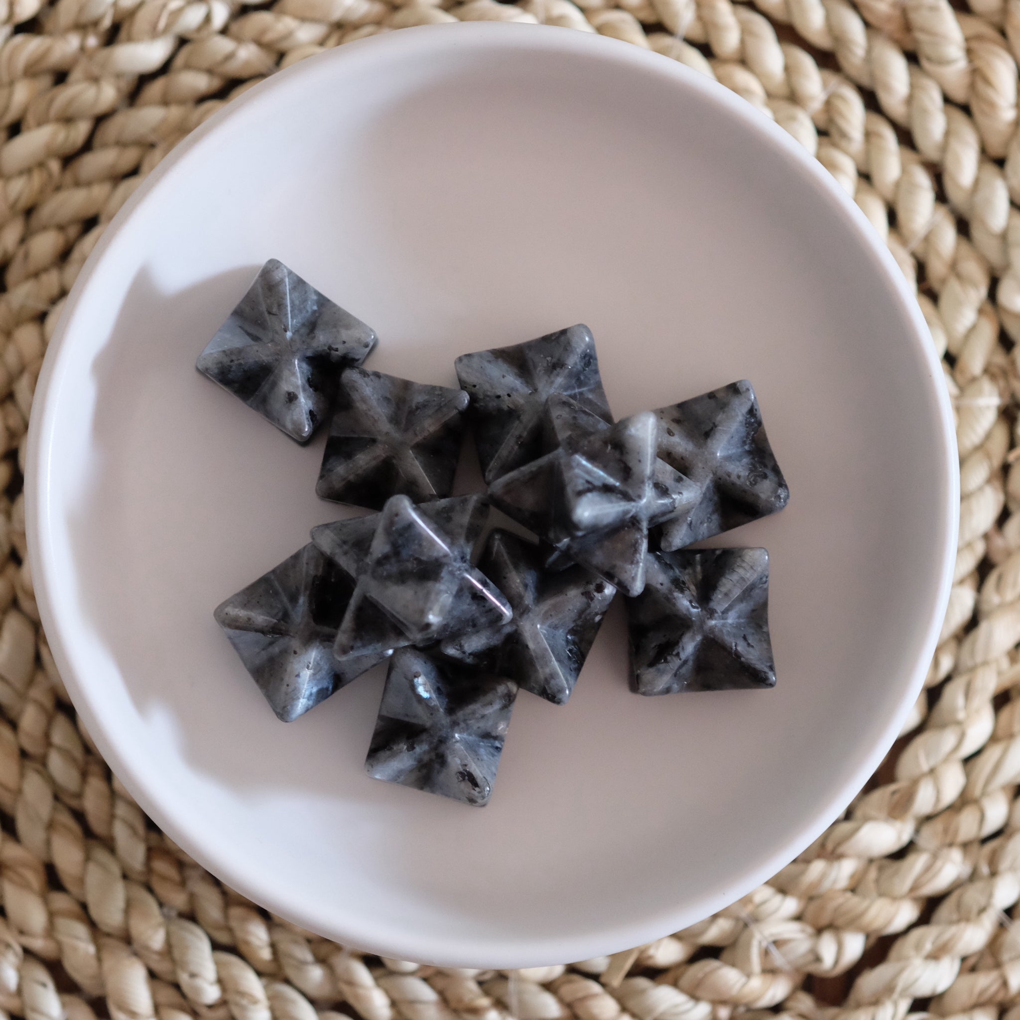 Larvikite Merkaba Star symbolise the union of the spirit of the body surrounded by light and comes from three separate words in Hebrew - 'Mer' meaning Light, 'Ka' meaning spirit and 'Ba' meaning body. The Merkaba is an eight pointed star created from two triangular pyramids and can be a source of power and enlightenment. Great to be used during mediation or Reiki. These little cuties are loved by kids and adults alike.