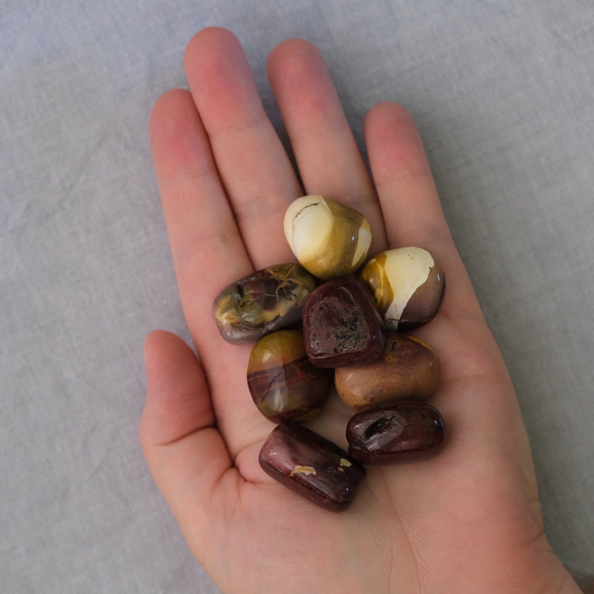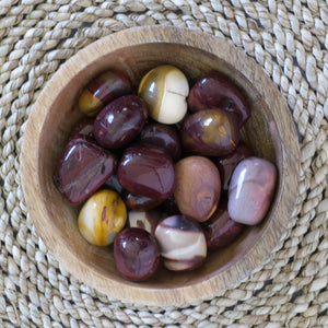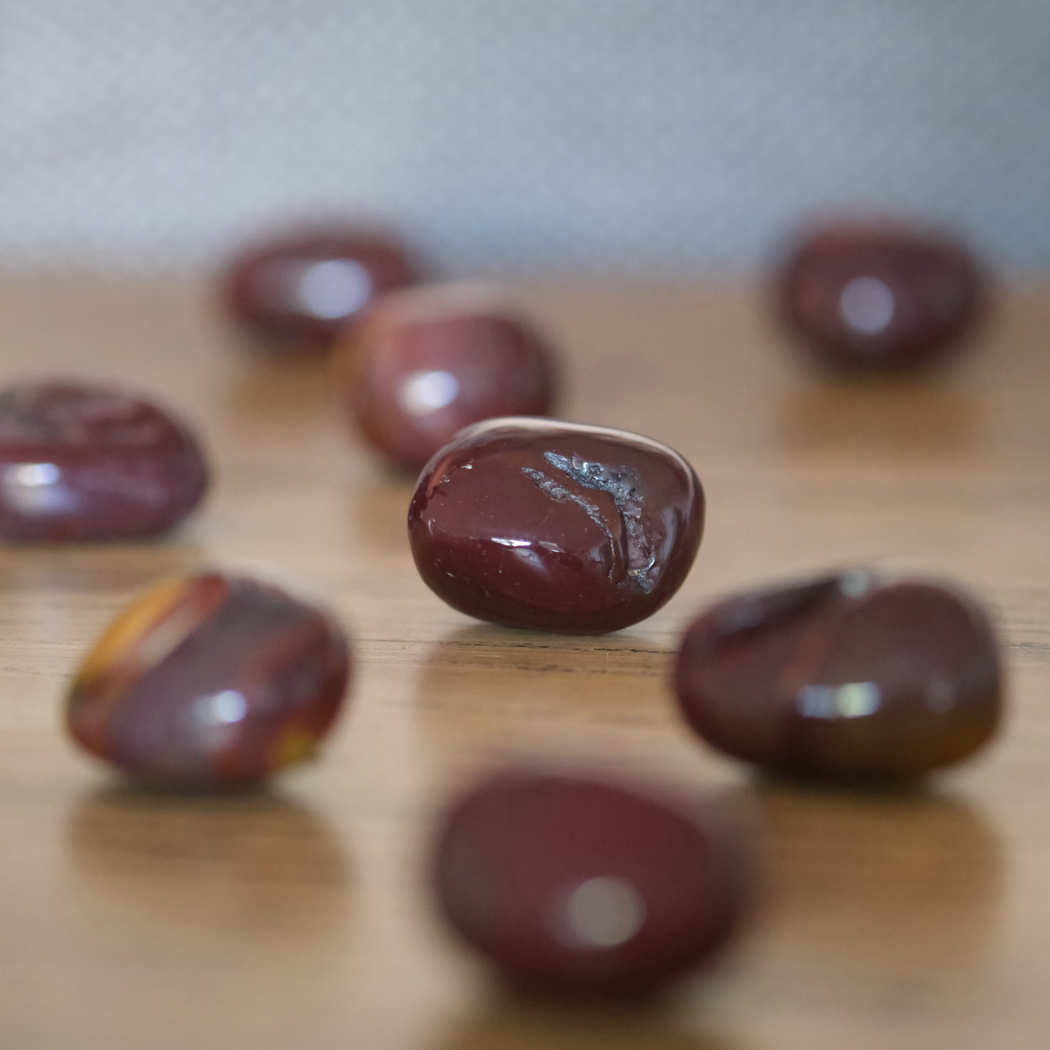 Mookaite Japer Tumbled Stones are polished stones that have a smooth surface with the rough edges tumbled out. This shape is perfect to carry in your pocket for those times when you need an energy boost or to use in meditation or Reiki.