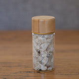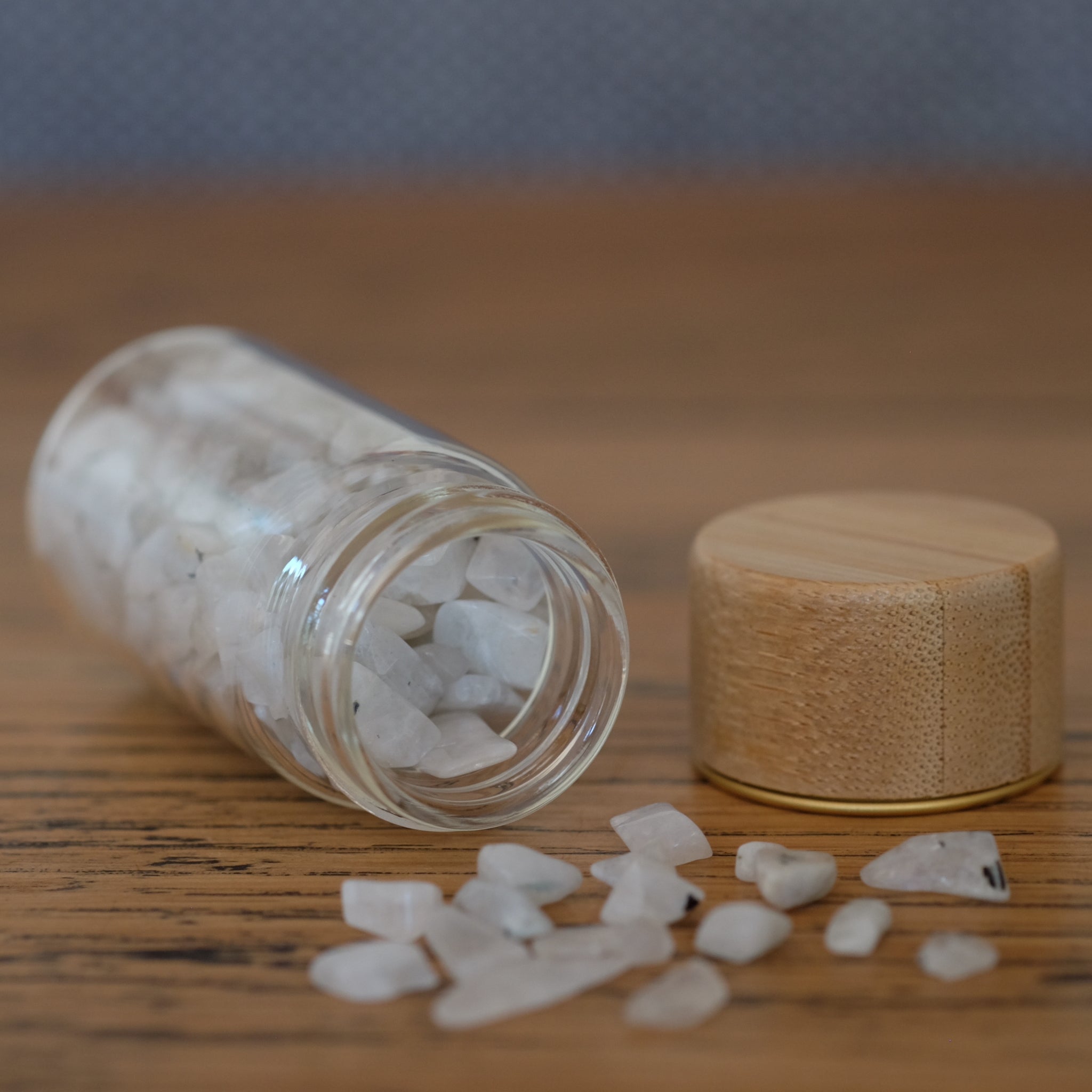Rainbow Moonstone Crystal Chips come in a glass bottle with a screw top wood bamboo lid so you don't lose any of the stones. They are perfect to leave in the bottle to keep on display, used for candle making or craft. Being small, they can fit in your purse or pocket when you don’t have the space for a tumbled stone and are also handy for adding to skin care, essential oil blends or foot baths. The Crystal Chips are also great for grid work, meditation or a reiki healing and once finished with, they can easily go back into the bottle for storage.