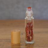 The opportunities are endless to create your own special essential oil blend or perfume with Red Jasper crystal chips. These gorgeous glass Crystal Roller Ball bottles are filled with crystals to maximise healing properties of the essential oils. Each bottle comes with a roller ball top that is covered with a beautiful bamboo wood screw cap. Essential Oil Crystal Roller Balls are practical and stylish making them perfect for self help or as a unique gift.