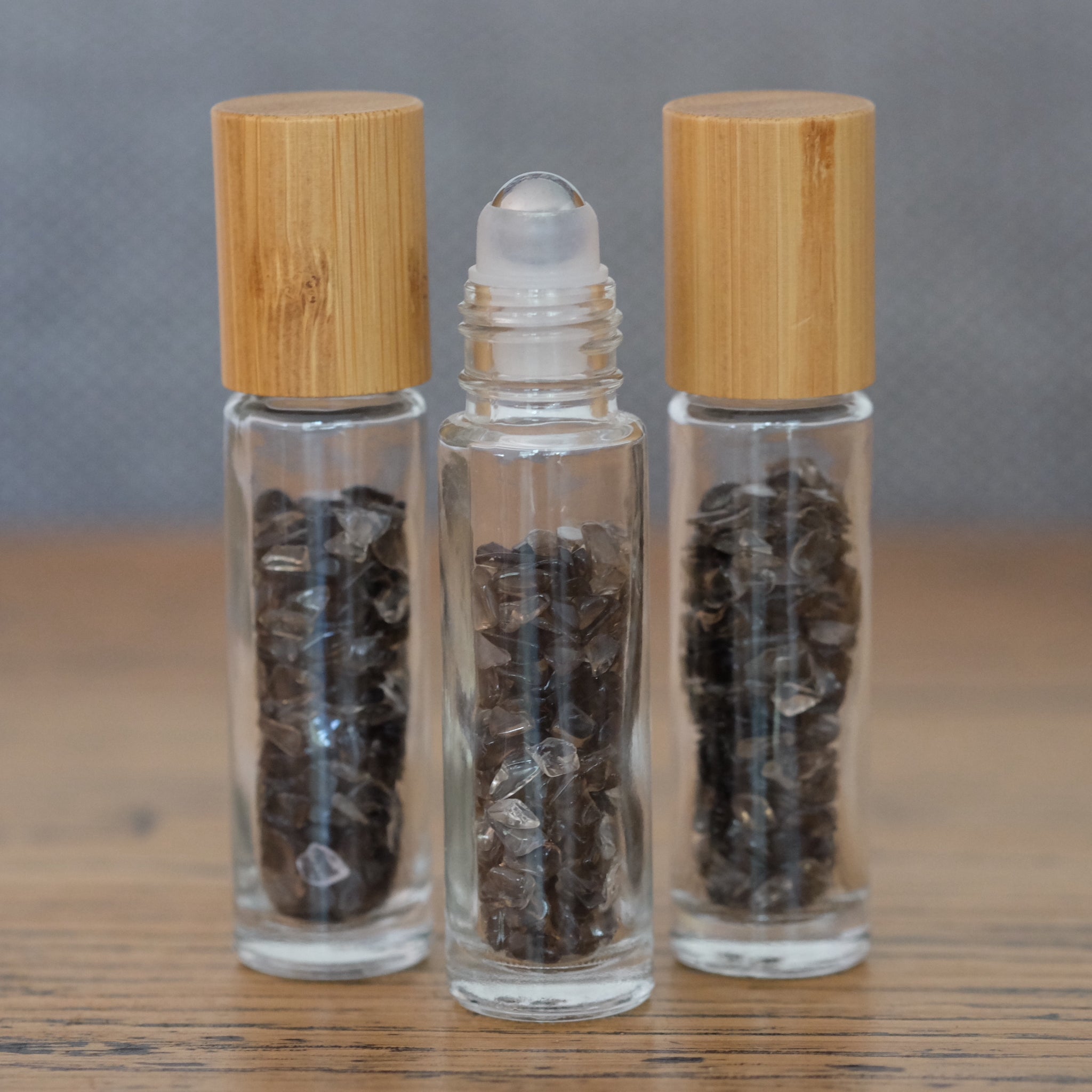The opportunities are endless to create your own special essential oil blend or perfume with Smoky Quartz crystal chips. These gorgeous glass Crystal Roller Ball bottles are filled with crystals to maximise healing properties of the essential oils. Each bottle comes with a roller ball top that is covered with a beautiful bamboo wood screw cap. Essential Oil Crystal Roller Balls are practical and stylish making them perfect for self help or as a unique gift.
