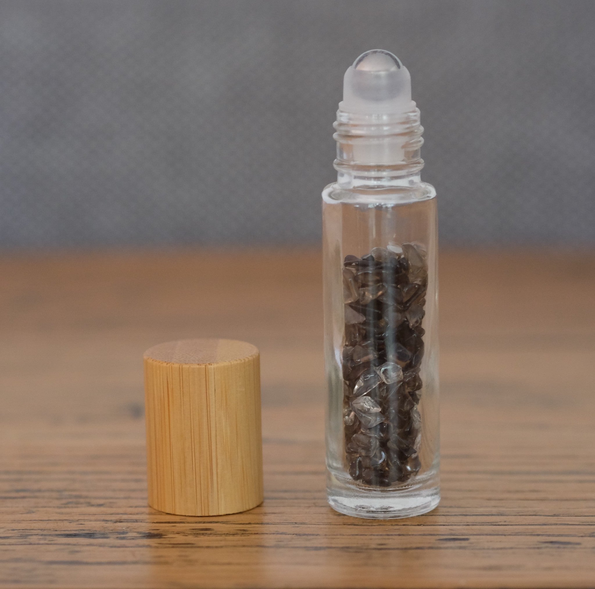 Comes with Smoky Quartz crystal chips and a stainless steel roller ball