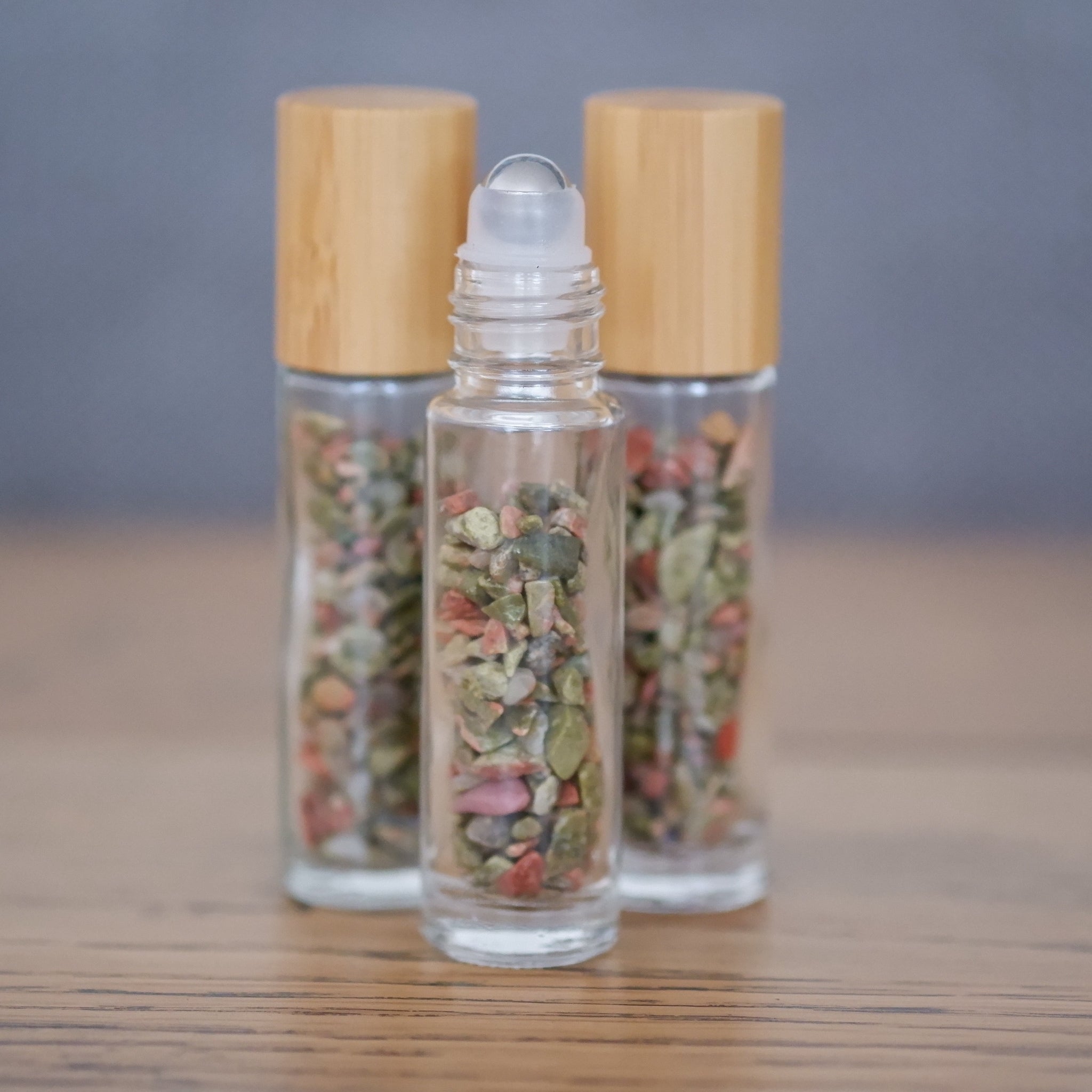 Comes with Unakite crystal chips and a stainless steel roller ball